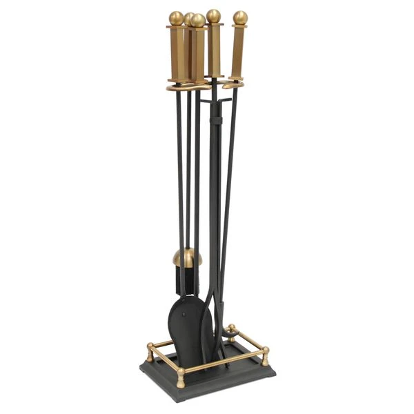 This Pilgrim 5 Piece Old English Tool Set is made with classic antique brass ball handles and is provided with a matte black finish. The 31 inch product comes with a solid cast iron base that is made available with a decorative tool rail. The pairing of the base and the rail provide delicately enhanced touches, and additional touches boost the quality as well. The log holder includes a tampico brush, tongs, shovel, and poker. Be the first to review “Pilgrim Antique Brass Old English Fireplace Tool Set”LoginRegister |