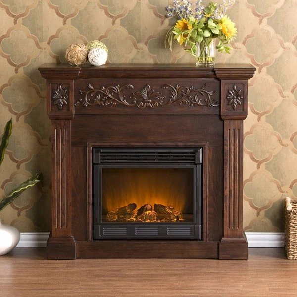 This fireplace gives you the convenience of an electric heater with the lovely look of a real fireplace. The heater produces up to 5000 BTU and can be controlled using the adjustable thermostat and the included remote control. Realistic flickering flames are created by LED lights, and the brightness is also adjustable. A thermal overload protector is a standard safety feature. The surround has elegant floral trim and a rich espresso finish. The mantel supports up to 85 pounds, up to a 47″ flat screen TV, so this piece is a perfect media room accent. The unit is tested to heat 1500 cubic feet in only 24 minutes using about the same energy as a coffee maker. Its exterior dimensions are 44.5″ W x 14.5″ D x 40.25″ T. Since no combustion takes place, no venting is required, and the glass remains safely cool to the touch. Be the first to review “SEI 45 Inch Calvert Carved Electric Fireplace With Mantel”LoginRegister |
